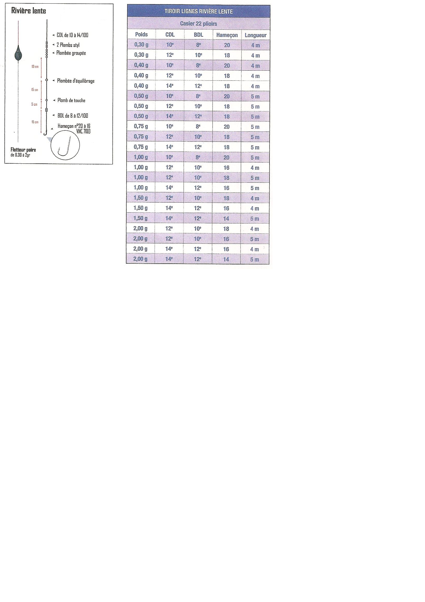 Mon casier est constitué de flotteurs allant de 0,30 g à 2 g(voir le tableau). Grâce à cela, je peux faire face a à peu près toutes les situations.